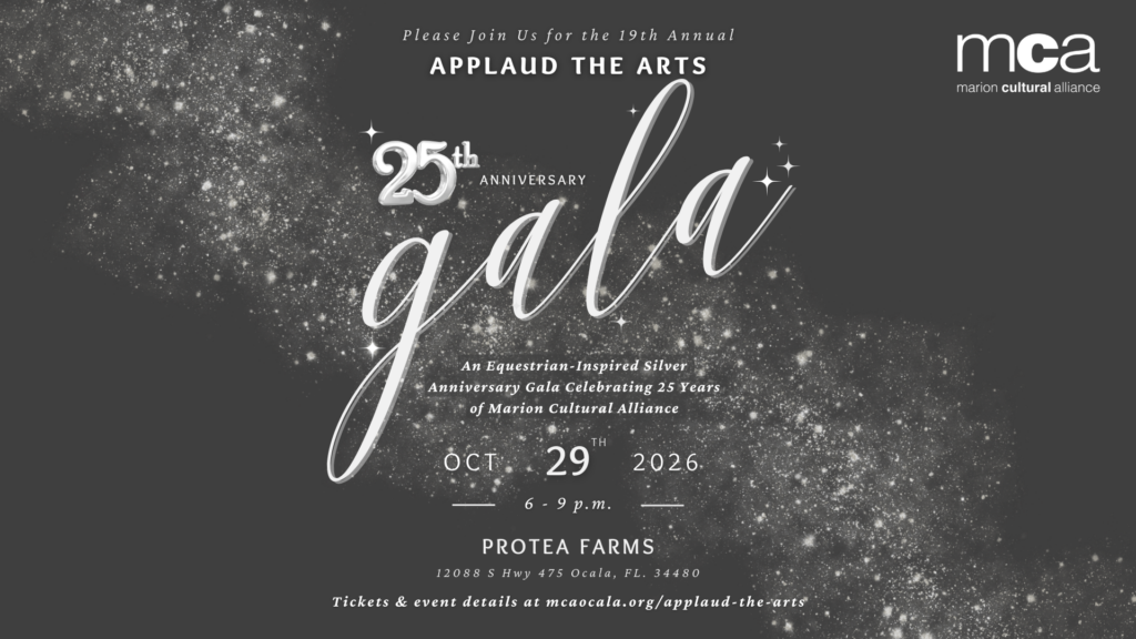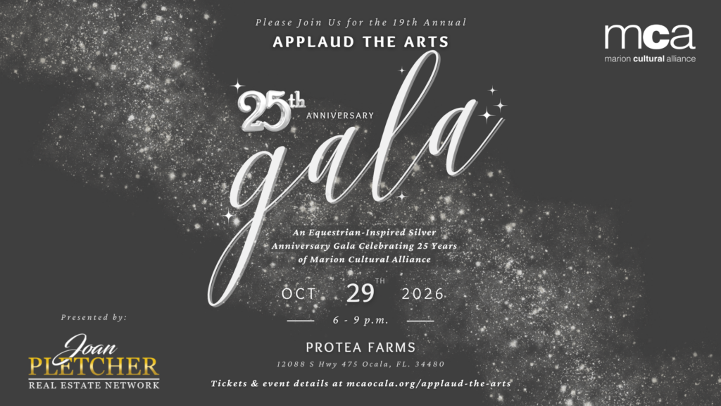 MCA annually presents Applaud the Arts, Ocala’s largest gathering of artists, arts organizations, MCA members, and the business community. This signature event kicks off the cultural season in Ocala with the announcement of arts awards, cultural grants recipients and is always set in one of our favorite cultural venues. Following the brief program, guests enjoy tapas, libations, and entertainment.