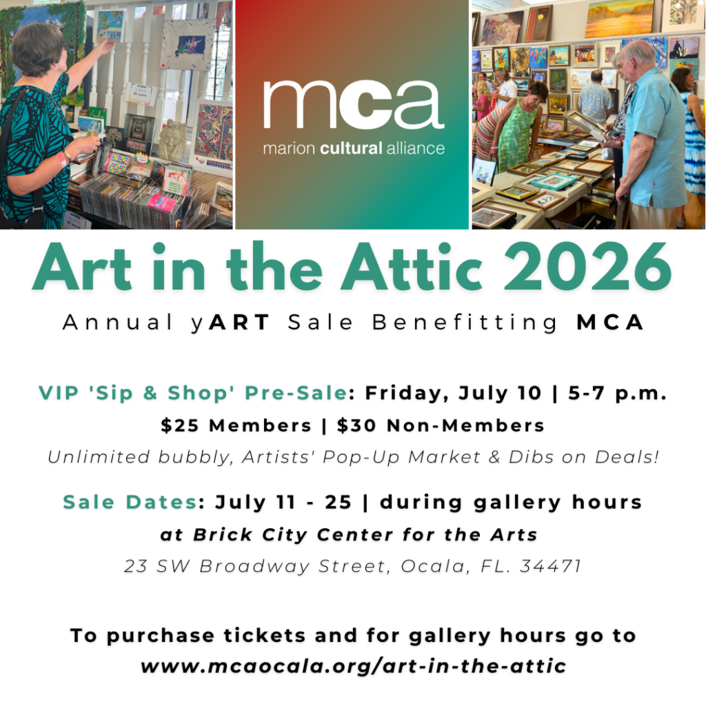 Marion Cultural Alliance’s y-ART Sale is a FUNdraising event that features previously enjoyed art at yard sale prices! Hundreds of works will be for sale including paintings, prints, drawings, photographs, and ALL will be sold at affordable prices! Early birds get the art treasures and great deals! Sip and shop while supporting the arts in Ocala/Marion County. For more information call us at 352-369-1500, or click here to email.