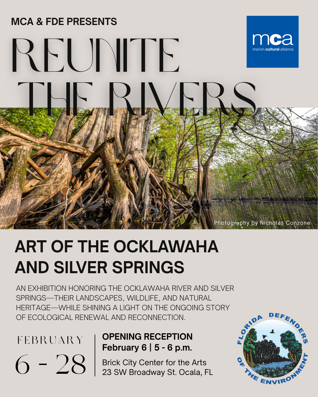 Sponsored by Florida Defenders of the Environment, in partnership with the Marion Cultural Alliance. Come experience the river through art and reconnect with a landscape that continues to inspire