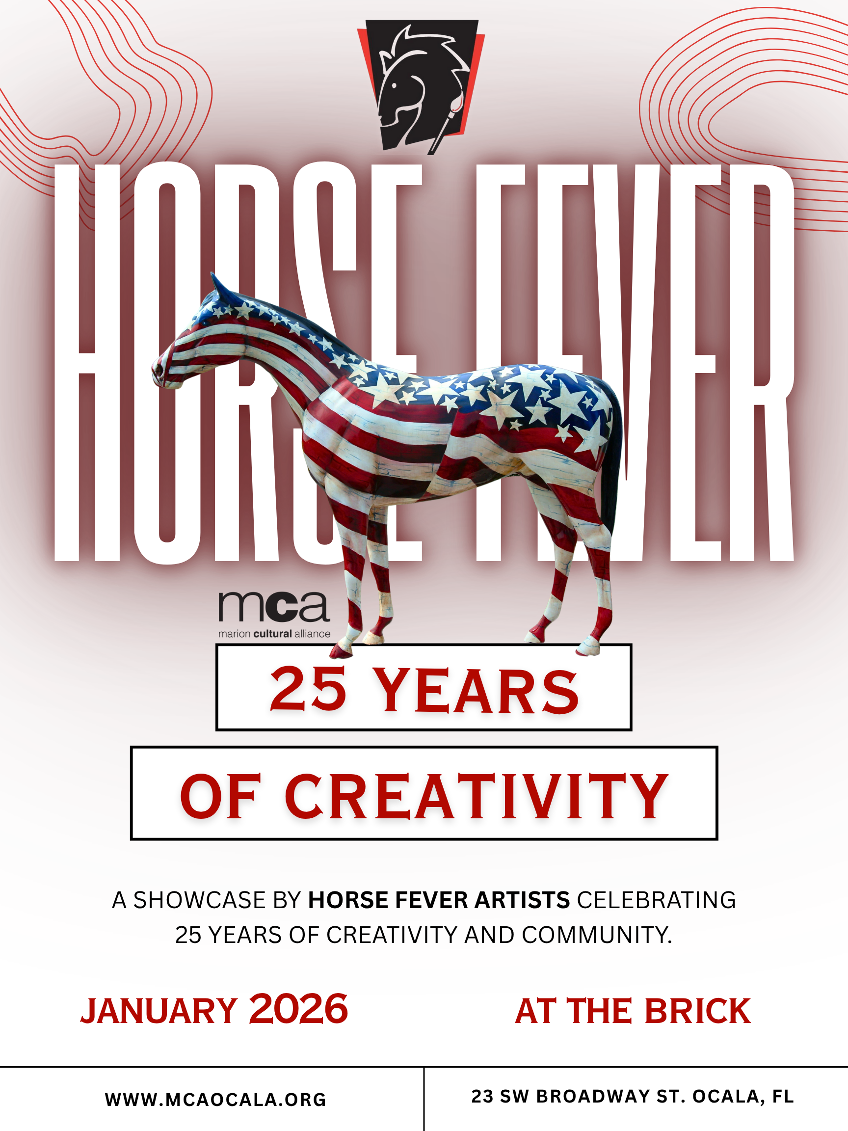 MCA will also be unveiling its brand-new 25th Anniversary Horse Fever sculpture, created by world renowned equine artist, Sharon Crute. Raffle tickets will be available at The Brick throughout the year. Raffle winner(s) will be announced in December 4 2026 at 6 pm during the Opening Exhibit Please visit mcaocala.org, or contact MCA at [email protected]